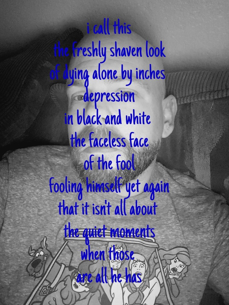 Written by m ennenbach02/03/201902/03/2019 (untitled)self Share this: Click to share on X (Opens in new window) X Click to share on Facebook (Opens in new window) Facebook Click to share on Reddit (Opens in new window) Reddit Click to share on Tumblr (Opens in new window) Tumblr Click to share on Pinterest (Opens in new window) Pinterest More Click to email a link to a friend (Opens in new window) Email Like Loading... 4 thoughts on “(untitled)self” can’t see you that well… LikeLiked by 1 person Reply I realise this is a sombre moment Mike and Iām understanding where you coming from but on the flip side… Loving the T-Shirt Dude šš»š. LikeLiked by 1 person Reply it’s why I didn’t crop it out. I thought it balanced out the words. Hahahaha LikeLiked by 1 person Reply Balance, something we strive for every day and probably fail so fucking miserably šš LikeLiked by 1 person Reply Leave a comment Cancel reply Δ