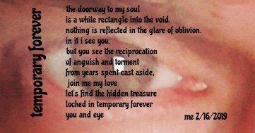 Written by m ennenbach02/17/201902/17/2019 temporary forever *my actual eye, the window to emptiness. ugly face, sometimes pretty eyes. Share this: Click to share on X (Opens in new window) X Click to share on Facebook (Opens in new window) Facebook Click to share on Reddit (Opens in new window) Reddit Click to share on Tumblr (Opens in new window) Tumblr Click to share on Pinterest (Opens in new window) Pinterest More Click to email a link to a friend (Opens in new window) Email Like Loading... 5 thoughts on “temporary forever” Ugly face is some metaphor? LikeLiked by 2 people Reply sure LikeLike Reply k LikeLiked by 1 person Reply That was my guess too, EC. LikeLiked by 1 person Reply The only possible answer LikeLiked by 1 person Reply Leave a comment Cancel reply Δ